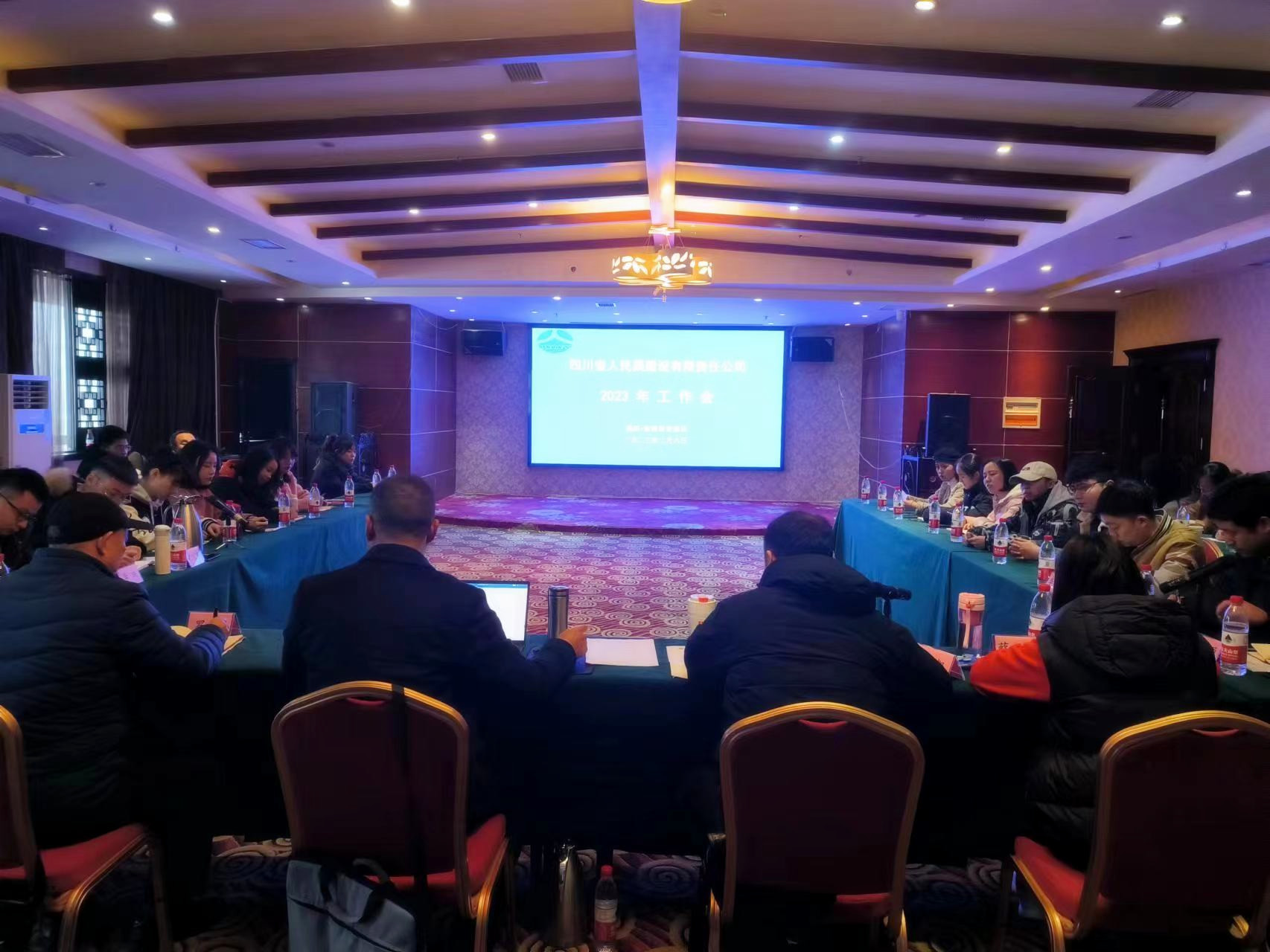 2023年2月6日上午9点30分,四川省人民渠建设有限责任公司在绵阳紫海原香酒店召开2023年工作会,会议由董事长周勇主持,公司全体人员参会。