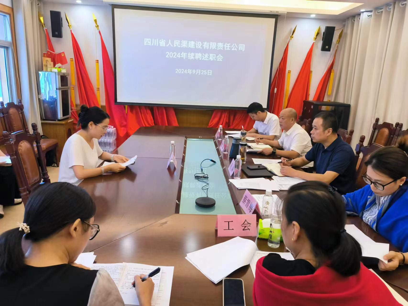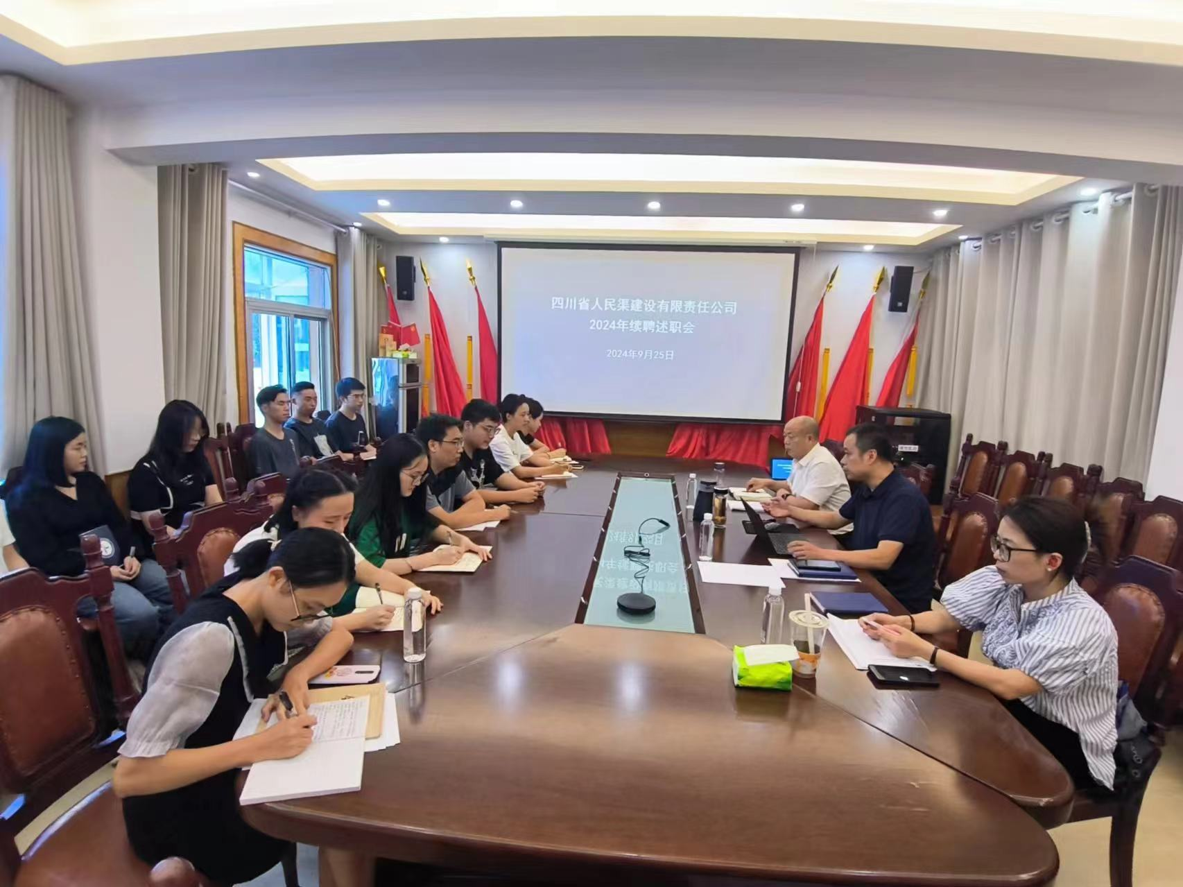 2024年9月25日,四川省人民渠建设有限责任公司在二楼会议室举行员工续聘述职会,述职对象为2022年招聘员工,公司经理层、部门负责人、工会代表听取述职。公司党支部书记、董事长、总经理周勇主持会议。